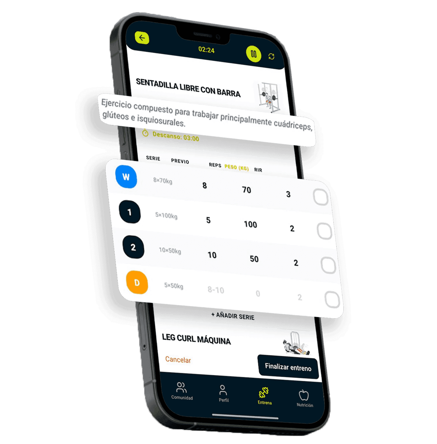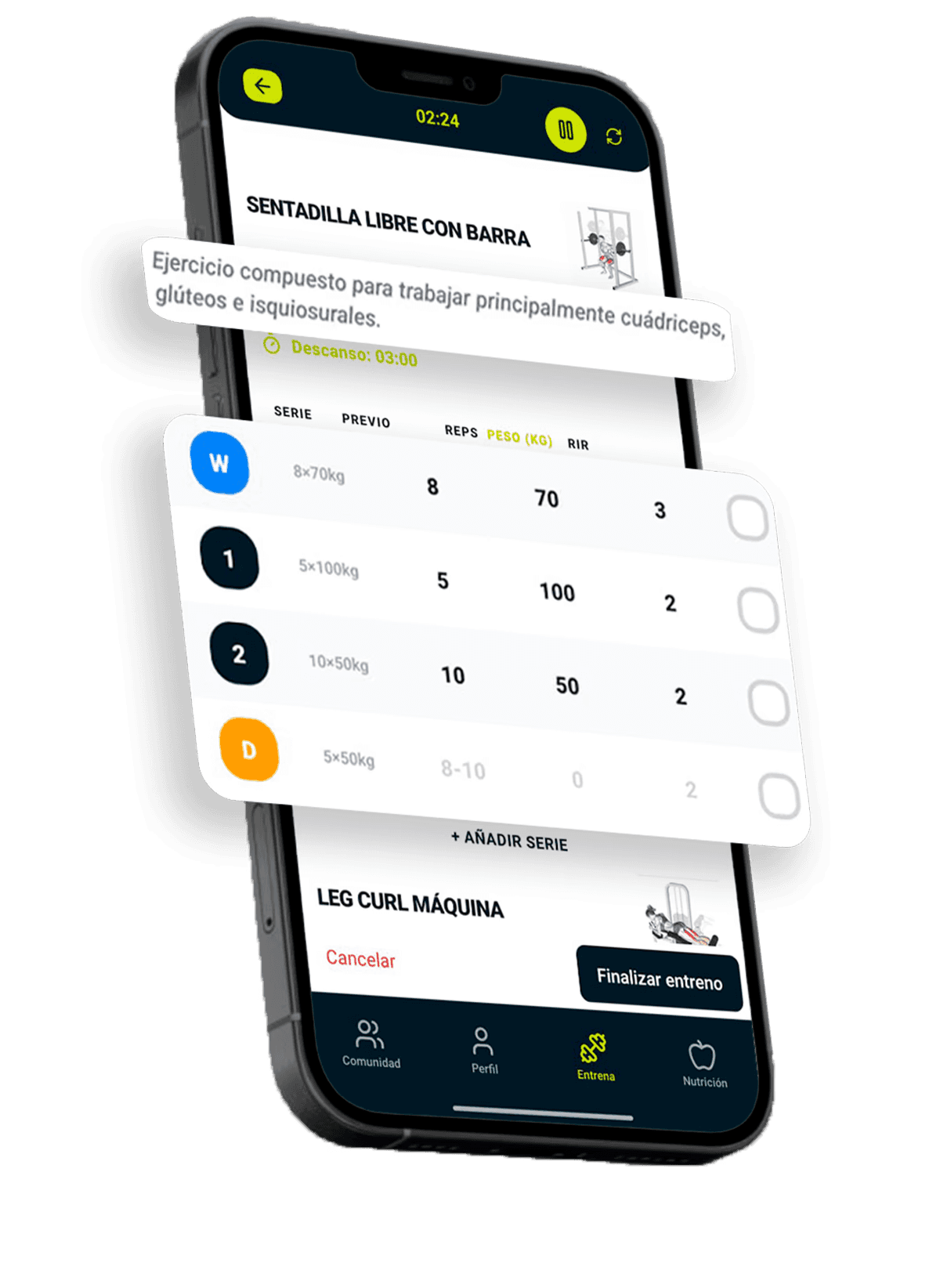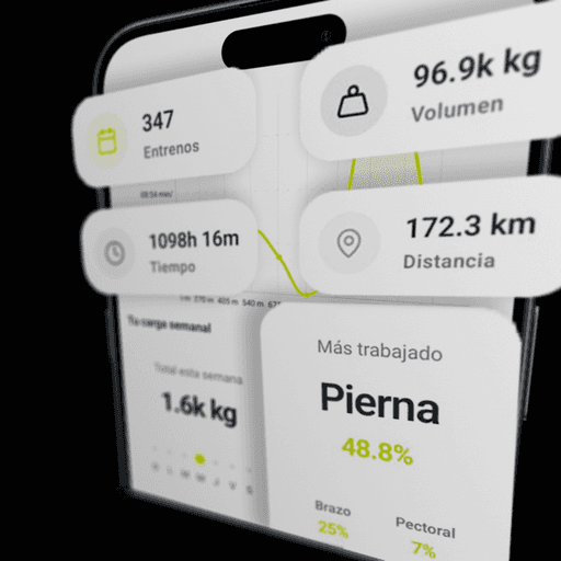 Registro de pesos, series y repeticiones.